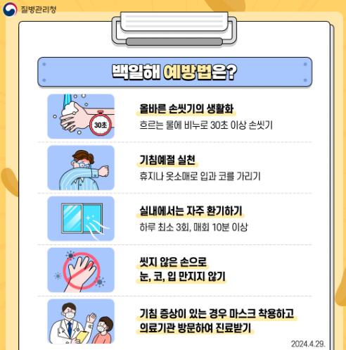 백일해를 예방하기 위해서는 ▲올바른 손 씻기(흐르는 물에 비누로 30초 이상 씻기) ▲기침 예절 실천(휴지나 옷소매로 입과 코 가리기) ▲실내에서는 자주 환기하기(하루 최소 3회, 매회 10분 이상) ▲씻기 않은 손으로 눈, 코, 입 만지지 않기 ▲기침 증상이 있는 경우 마스크 착용하고 의료기관 방문하여 진료받기 ▲적기 예방접종 받기 등 예방수칙을 준수해야 한다.
