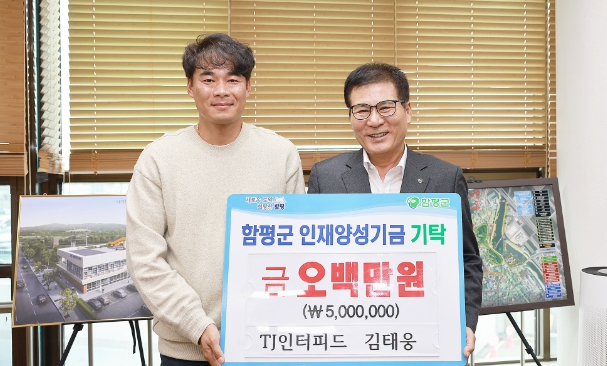 함평군 관계자는 “15일 김태웅(TJ인터피드) 대표가 함평군 인재양성기금에 5백만원을 기탁했다”고 밝혔다.