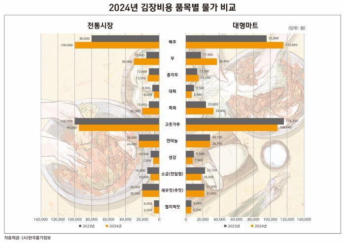 할인 지원을 제외한 배추 20포기 가격은 전년대비 25% 증가한 10만원으로 나타났다. 무 10개 가격은 전년 1만5000원에서 올해 3만원으로 2배로 뛰었다. 쪽파 2단과 총각무 3단 가격은 각각 66.67%, 12.50% 증가했다.
