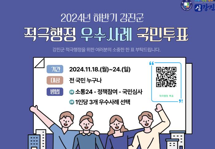 투표 참여는 소통24 내 정책참여-국민심사 게시판에서 ‘2024년 하반기 강진군 적극행정 우수사례 국민투표’를 클릭해 총 3건을 선정하면 된다.