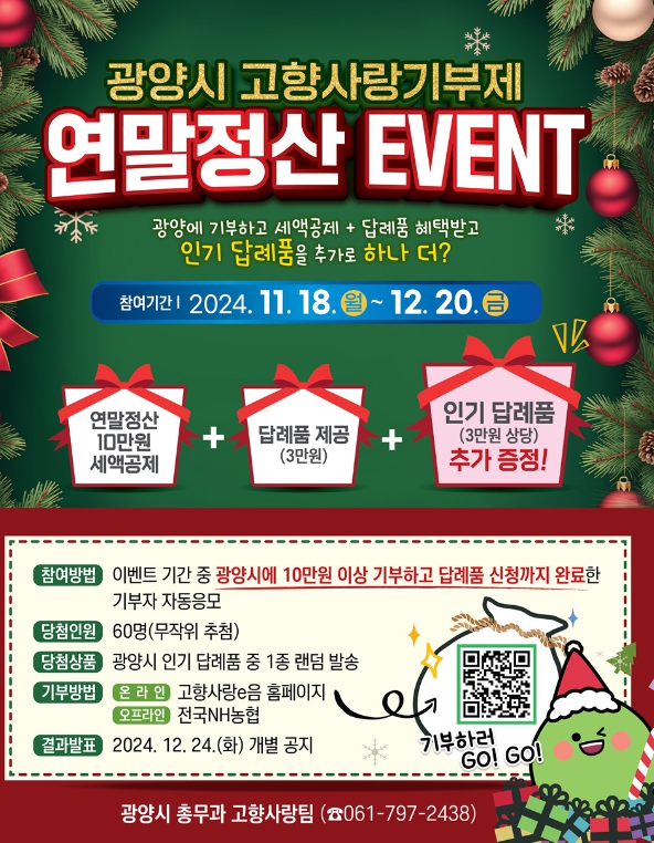 고향사랑기부제 연말정산 이벤트에 참여하고자 하는 사람은 ‘고향사랑e음’이나 전국 NH농협을 통해 광양시에 고향사랑기부를 한 후 ‘고향사랑e음’을 통해 답례품 신청까지 완료해야 한다.