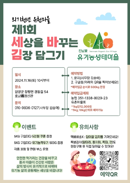 담양군에 따르면, ‘제1회 세상을 바꾸는 김장 담그기’ 행사가 지난 16일 마을 주민, 전남도 친환경농업협회 회원, 관광객 등 100여 명이 참여한 가운데 열렸다.