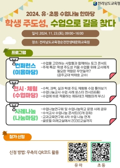 이번 행사는 ‘학생 주도성, 수업으로 길을 찾다’를 주제로, 학생 주도성 키움 수업 나눔과 전남교육이 나아가야 할 수업의 방향 및 교사의 역할 모색을 위한 공감의 장으로 마련된다.