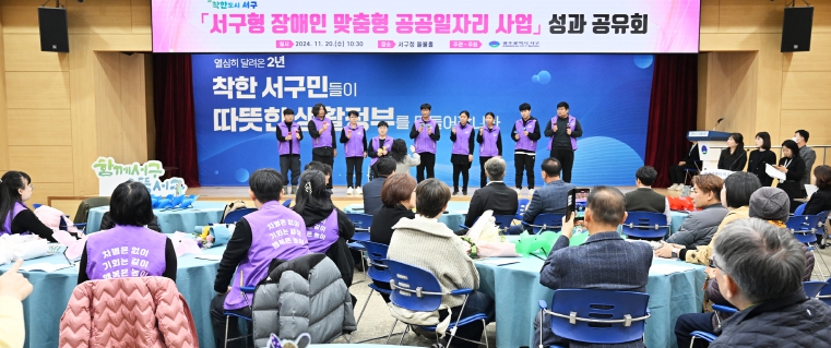 서구는 20일 서구청 들불홀에서‘서구형 장애인 맞춤형 공공일자리사업 성과공유회’를 열고 그간의 사업 성과를 공유하는 자리를 가졌다. 특히 이날 성과공유회는 장애인들이 행사 진행과 공연 등을 맡아 장애인과 비장애인의 구분 없는 일상의 필요성을 강조했다.