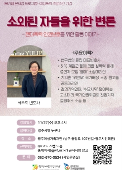 강연자 하주희 변호사는 ▲‘열매’(5·18 계엄군 등에 의한 성폭력 피해 증언자 모임) 소송대리인 ▲기지촌 위안부 국가배상 소송 원고 공동대리인 ▲정의기억연대 소송대리인 등 인권보호 활동 현장에서의 생생한 경험을 바탕으로 여성에 대한 구조적 폭력에 대한 고민과 소외된 자들의 인권 실현을 위한 방안 등에 대해 강연을 펼칠 예정이다.