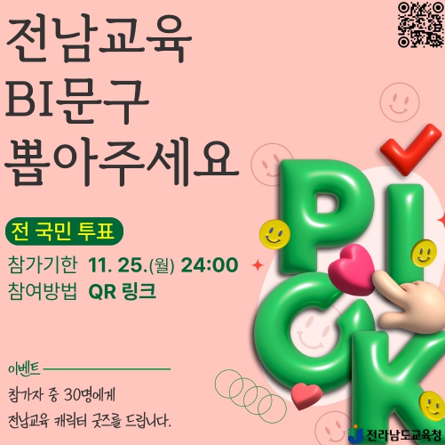 투표는 11월 25일 자정까지 온라인으로 진행되며, 전라남도교육청 대표 누리집(공개자료실)과 ‘전남교육통’에서 참여가 가능하다. 전남교육청은 국민의 손에 의해 문구를 선택한 뒤 전문 디자이너 등과 협력해 BI 디자인을 완성할 계획이다.