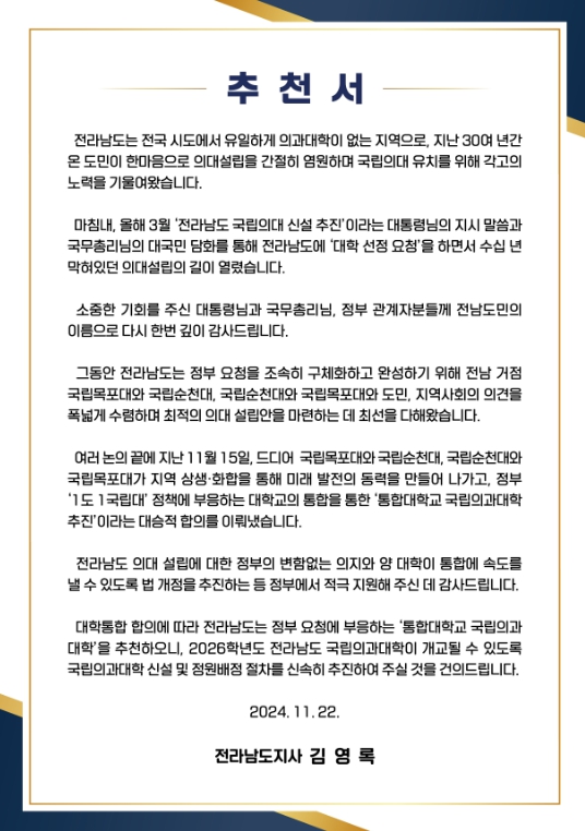 전남도는 추천서에서 “올해 3월, 정부에서 대통령과 대국민담화를 통해 ‘전라남도 국립의대 신설 추진’을 발표하고, 전남도에 대학 선정을 요청하면서 의대설립의 길이 열렸다”면서 “정부 요청에 따라 거점 국립대인 국립목포대와 국립순천대, 도민과 지역사회의 의견을 폭넓게 수렴하며 최적의 의과대학 설립안을 마련하기 위해 최선을 다했다”고 밝혔다.