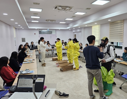 훈련은 생물테러 대응 체계 전반 교육과 함께 개인보호장비 이해와 관리 방법, 개인보호구(Level A, C)착탈의 훈련, 다중탐지키트 활용법 등으로 진행했다.