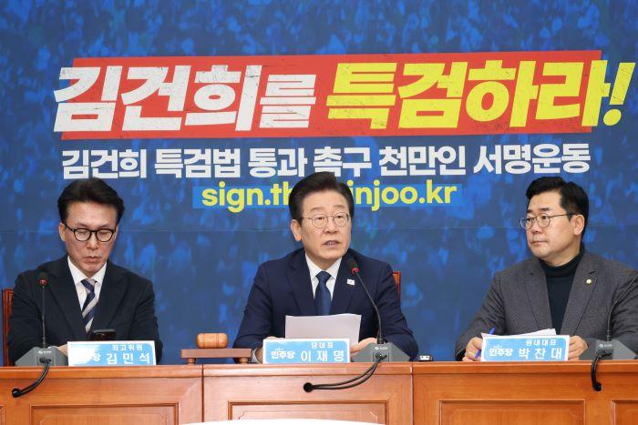 민생·경제가 어렵다며 정부의 긴축재정 기조도 문제 삼았다. 이 대표는 "IMF(국제통화기금)가 경제회복력 강화를 위해 세입 확충을 하라고 권고했다"며 "꺼져가는 불씨를 살리고 민생 회복을 위해서는 적극 재정 기조로의 전환이 반드시 필요하다"고 강조했다. 그러면서 "초부자 감세를 강행하면서 양극화를 완화하겠다는 국정 목표는 '허장성세'"라며 "말이 아니라 행동하라"고 촉구했다.