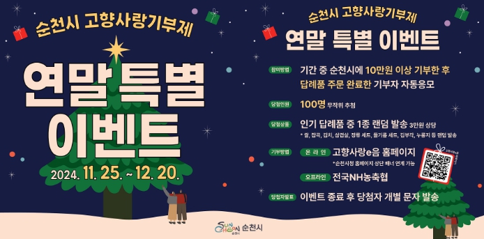 시 관계자는 “연말정산 시즌을 맞아 고향사랑기부제 활성화와 감사의 마음을 전하고자 인기 답례품 추가 증정 이벤트를 마련했으니, 많은 분들의 참여를 바란다”고 말했다.