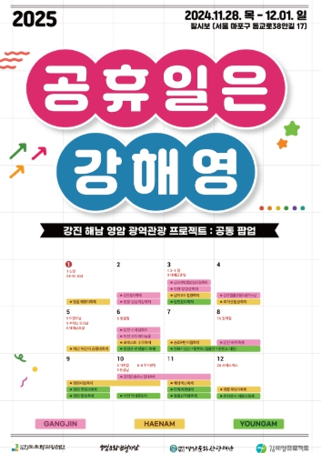 (재)영암문화관광재단 관계자는 “연말연시를 앞두고 공휴일은 강해영 팝업 공간에서 2025년 새로운 시작을 다짐하고, 여행 계획도 세워보길 바란다. 강진·해남·영암의 매력을 느끼고 방문할 마음이 들도록 알차게 공간을 구성했다. 이번 이벤트를 강진·해남·영암 관광의 완벽한 시작점으로 만들겠다”라고 소개했다.