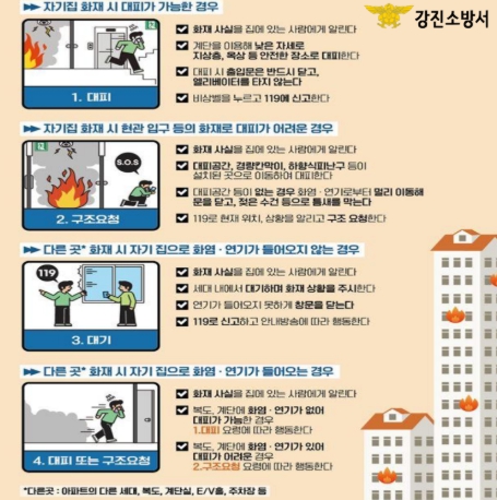 아파트 화재의 특성상 다수의 인명피해 발생 우려가 있기 때문에 화재 시 행동 요령을 모든 입주민이 숙지해 유사시 인명피해를 최소화할 수 있도록 해야 한다.