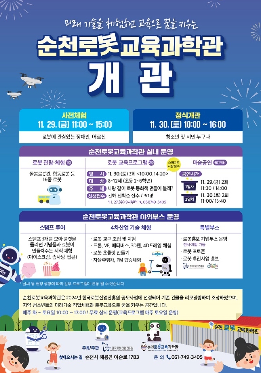 30일에는 순천로봇교육과학관 정식 개관과 로봇에 관심 있는 시민 누구나 참여할 수 있는 로봇 체험회가 개최된다.