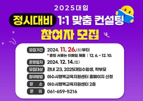 모집인원은 60여 명으로, 참여를 희망하는 수험생과 학부모는 여수시행복교육지원센터 누리집을 통해 신청하면 된다.