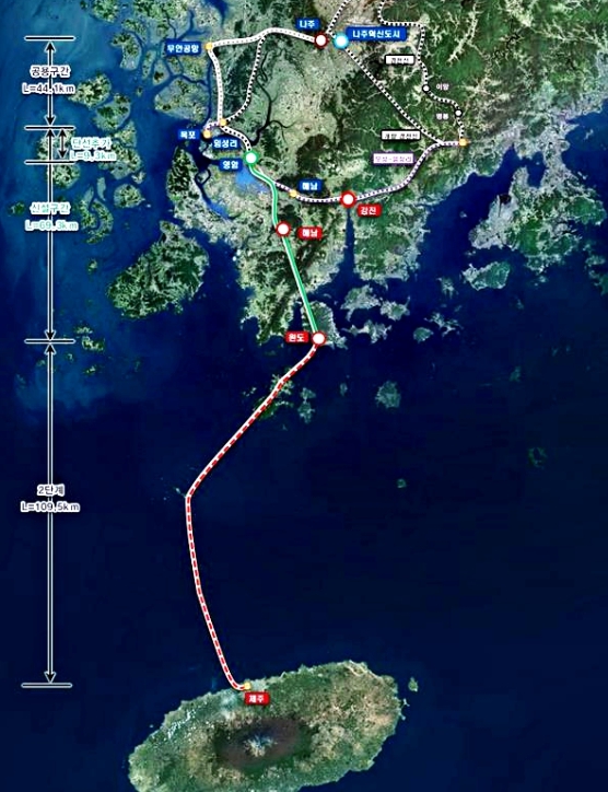 서울~제주 고속철도 노선은 목포에서 영암, 해남, 완도를 잇는 지상 철도 구간과 완도에서 제주까지 해저터널을 연결하는 구간으로 이뤄진다. 3개군은 막대한 사업비와 제주도의 반대 여론을 감안해 1단계로 영암과 해남, 완도로 이어지는 육지 구간을 먼저 연결하는 방안을 제시하고 있다.