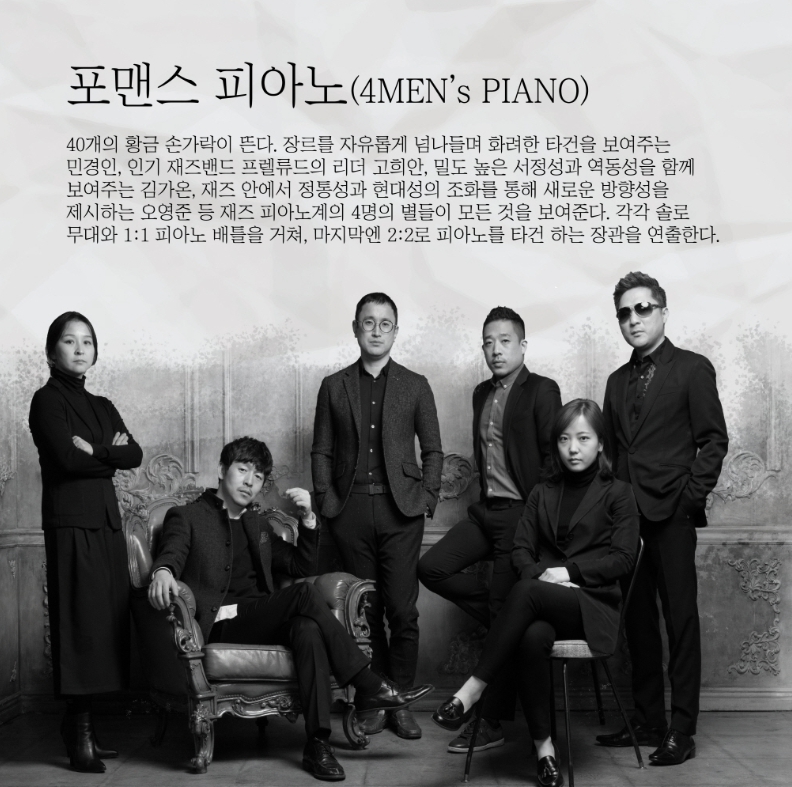 2회차 공연의 주인공인 포맨스 피아노(4Men’s Piano)는 국내 최정상급 피아니스트 4인으로 구성된‘누구도 흉내 낼 수 없는 건반 위 황금 손가락’이라고 불리는 재즈 피아노 그룹으로, 이번 공연에서 멤버 간 화려한 피아노 배틀로 ‘Spain’, ‘Shape of My Heart’, ‘The Girl from Ipanema’ 등의 명곡을 피아노 앙상블로 재해석할 예정이다.