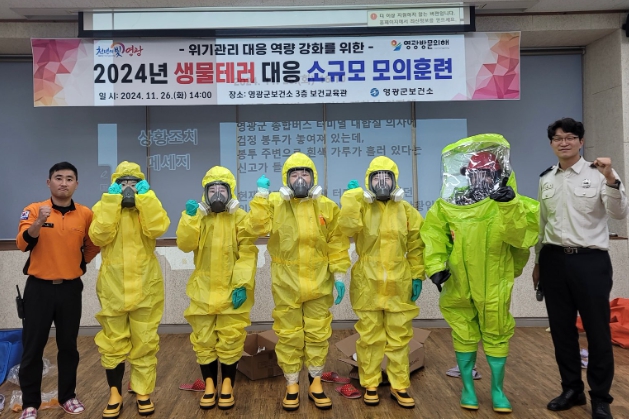 이번 훈련은 영광군 고추특화시장 내 의문의 남성이 흰색 가루를 뿌리고 달아나는 상황을 설정해 초기대응 교육, 개인보호구(레벨 A, 레벨 C) 착·탈의, 3중 수송용기 사용 및 검체 이송 실습 등 실전 대응에 맞춰 체험형 시연으로 진행했다.