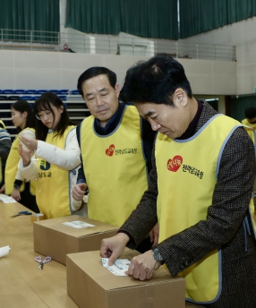 이날 김대중 교육감을 비롯한 도교육청 간부들은 실생활에 도움이 되고 학생들이 선호하는 신발을 선물로 준비해 정성들여 포장했다.
