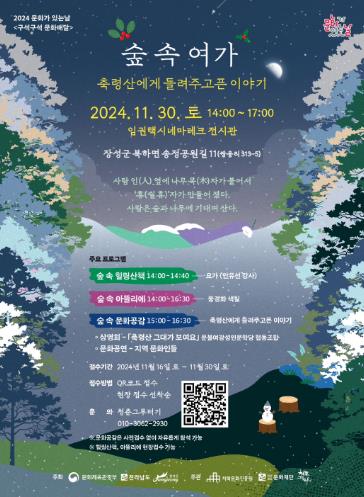 ‘숲속여가’ 활동을 담은 영상 상영회와 지역 문화인들이 참여하는 판소리, 시낭송, 악기연주 등도 준비된다.