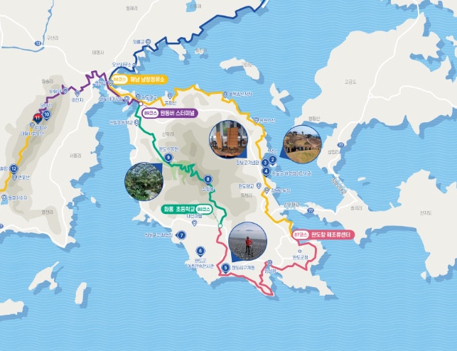 완도 남파랑길 86 코스(24.5km)는 옛 남창교에서부터 청해진 유적지를 지나 완도해조류센터까지, 87 코스(18km)는 해조류센터에서 완도타워, 정도리 구계등, 화흥초등학교에서 끝난다.