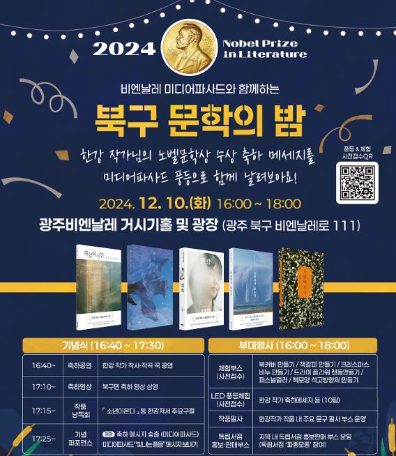 28일 북구에 따르면 다가오는 ‘한강 작가 노벨문학상 시상식’을 기념하여 오는 12월 10일 오후 4시 광주비엔날레 거시기홀과 비엔날레 광장에서 ‘미디어파사드와 함께하는 북구 문학의 밤’ 행사가 개최된다.