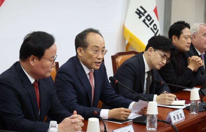 추 원내대표는 이과 관련 "민주당이 (본회의에서) 특검법 우회를 위한 상설 특검 규칙 꼼수 개정안 처리와 국가 예산 발목잡기법을 강행하고, 신영대 민주당 의원의 체포동의안을 부결시킨다면 대한민국 국회를 보복과 방탄의 무기로 전락시키는 것"이라고 비판했다.