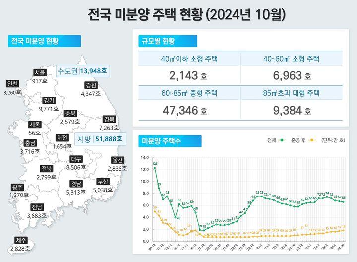 29일 국토교통부가 발표한 10월 주택통계에 따르면 지난달 말 기준 전국의 미분양 주택은 6만5836호로 전월 대비 940호(1.4%) 감소했지만 준공후 미분양 주택은 전월 대비 1045호(6.1%) 증가한 1만8307호로 집계됐다.