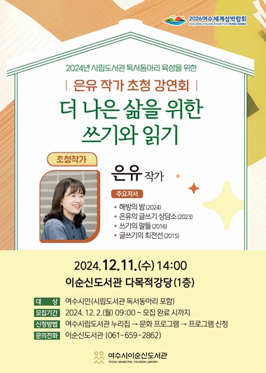 강연회 참여를 희망하는 시민과 시립도서관 독서동아리 회원은 12월 2일 오전 9시부터 여수시립도서관 누리집 문화 프로그램에서 신청하면 된다.