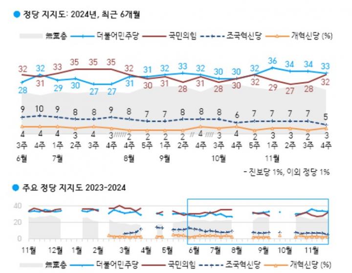 한국갤럽이 지난 26일부터 28일까지 전국 만 18세 이상 1001명을 대상으로 11월 3주차 정당 지지도를 조사한 결과, 국민의힘은 32%, 민주당은 33%로 집계됐다. 조국혁신당 5%, 개혁신당 3%, 진보당 1%, 이외 정당 1%, 특정 정당을 지지하지 않는 무당층 24%로 나타났다.