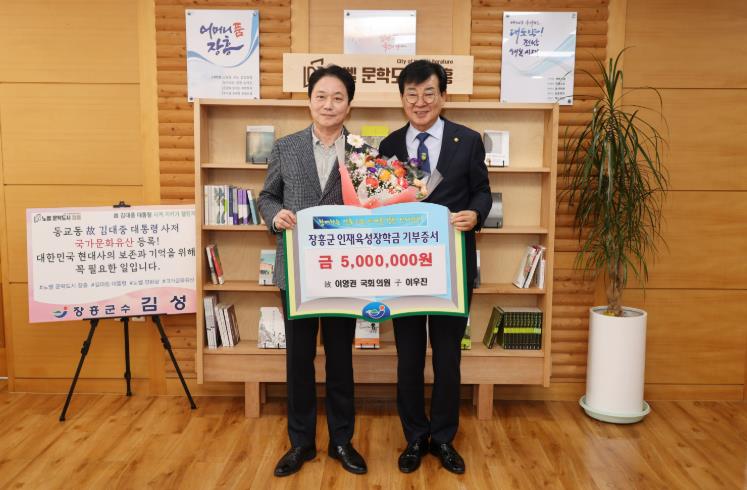 김성 장흥군인재육성장학회 이사장은 “고 이영권 국회의원은 지역사회를 위해 헌신하며 지역발전에 큰 도움을 주셨던 분”이라며, “소중한 기탁금은 앞으로 많은 학생들이 큰 꿈을 가지고 더 좋은 환경에서 공부할 수 있도록 지원하겠다”고 말했다.