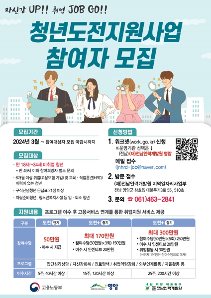 고용노동부의 청년 도전 지원사업은 취업난과 비정규직 일자리 등으로 구직을 단념하거나 사회와 단절돼 있는 청년들에게 도전 기회를 제공하는 내용.