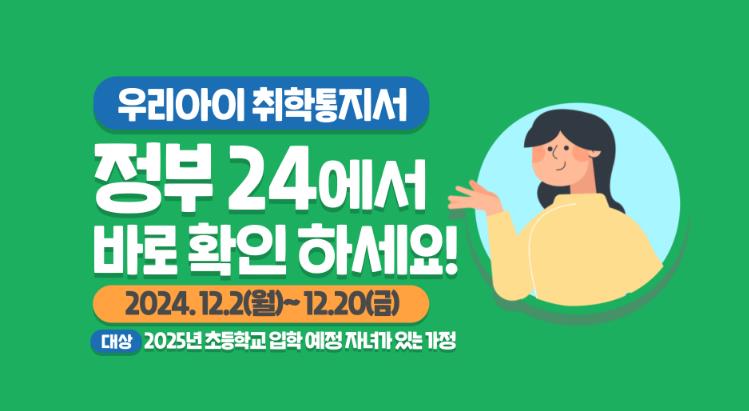 온라인 취학통지서 발급은 2일 오전 10시부터 오는 20일 자정(24시)까지 정부24 누리집에서 본인 확인 후 신청할 수 있다.