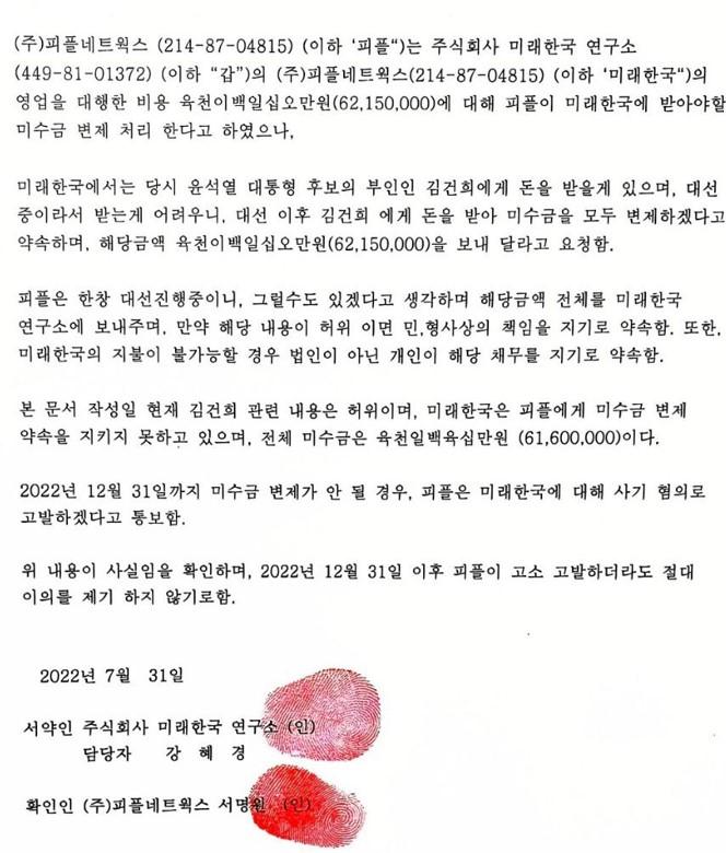 각서에는 또 "피플은 한창 대선 진행 중이니 그럴 수 있겠다고 생각하며 해당 금액 전체를 미래한국연구소에 보내주며 만약 해당 내용이 허위이면 민형사상의 책임을 지기로 약속한다"며 "또한 미래한국의 지불이 불가능할 경우 법인이 아닌 개인이 해당 채무를 지기로 약속한다"는 문구도 쓰였다.
