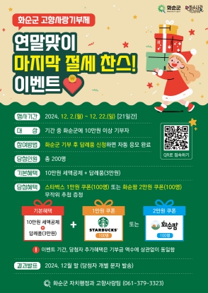 이벤트 기간 내에 화순군 기부 참여자를 대상으로 총 200명에게 무작위 추첨으로 스타벅스 1만 원 쿠폰(100명), 또는 화순팜 2만 원 쿠폰(100명)을 추가 증정할 예정이다.