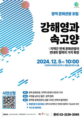또한 지역 연계 협력 우수사례인 강해영(강진‧해남‧영암)과 속고양(속초‧고성‧양양) 지역의 사례 중심으로 광역 문화‧관광의 미래비전과 방향성을 공론화하여 지역 연대 확장의 가능성을 모색한다.