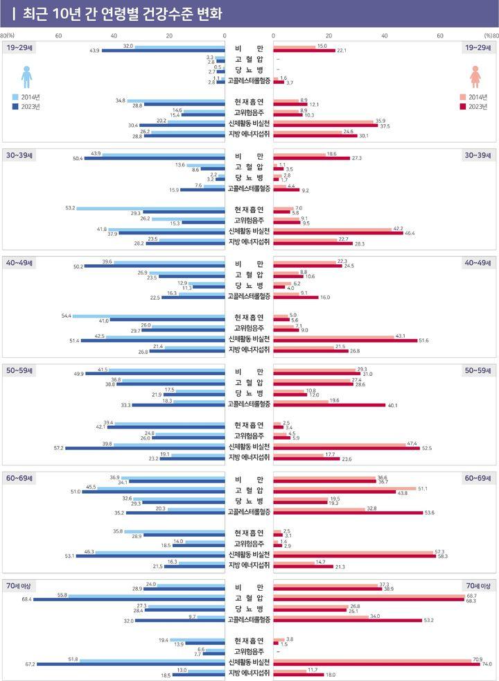 이 밖에 주요 결과를 보면 남성의 경우 비만율은 2014년 37.8%에서 2023년 45.6%로, 고콜레스테롤혈증은 11.2%에서 19.9%로 증가했다. 반면 고혈압은 23.8%에서 23.4%로, 당뇨는 11%에서 12%로 큰 차이가 없었다.
