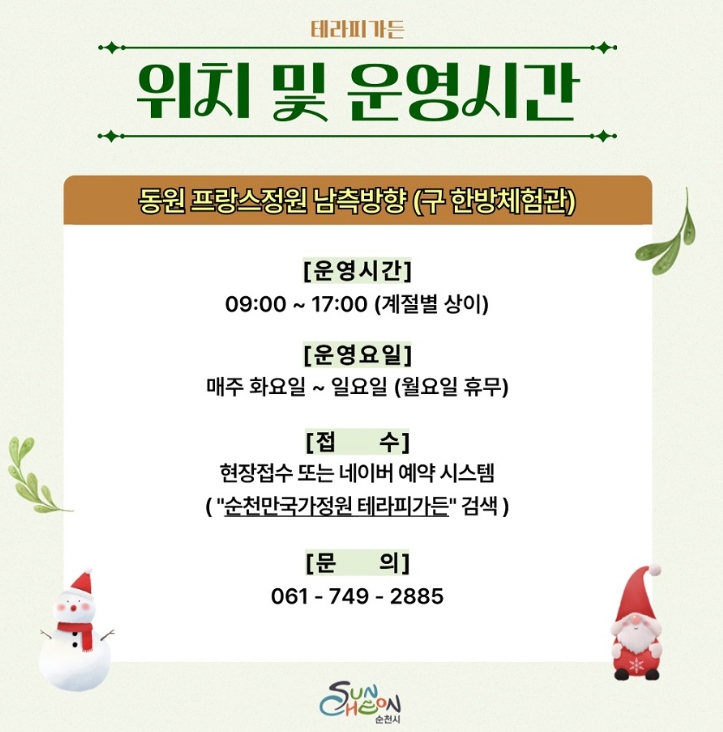 참여를 원하시는 분은 네이버에서 ‘순천만국가정원 테라피가든’을 검색하면 예약할 수 있다.