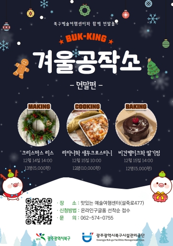 북-킹 ‘겨울공작소’는 문화예술교육 ‘라이트스튜디오’, 양식 레스토랑 ‘폼(fo_m)’, 제로웨이스트카페 ‘뭉몽만남’의 광주 청년 소상공인을 강사로 초빙해 주민들과 한층 더 가까운 프로그램을 운영한다. 연말을 맞이해 광주를 방문하는 관광객과 시민들에게 북구에서 따뜻한 기억을 만드는 시간이 되길 바란다.