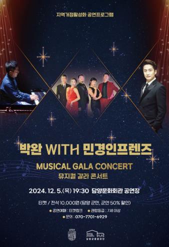 박완 with 민경인프렌즈 뮤지컬 갈라 콘서트는 연말을 맞아 재단에서 특별 기획한 공연으로, 뮤지컬 배우 박완의 대표적 출연작의 하이라이트 곡들을 재즈 피아니스트 민경인이 이끄는 밴드의 연주와 함께 직접 들을 수 있다.