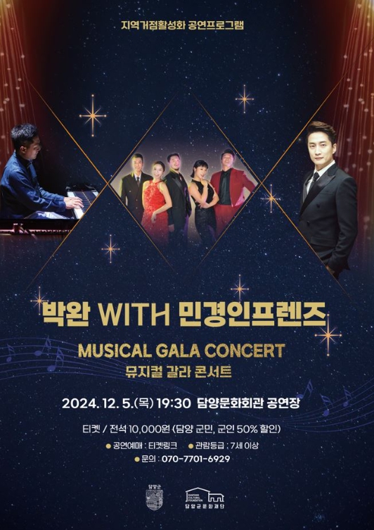 [나이스데이](재)담양군문화재단은 오는 5일 저녁 7시 30분 담양문화회관 공연장에서 박완 with 민경인프렌즈 뮤지컬 갈라 콘서트를 개최한다고 밝혔다.