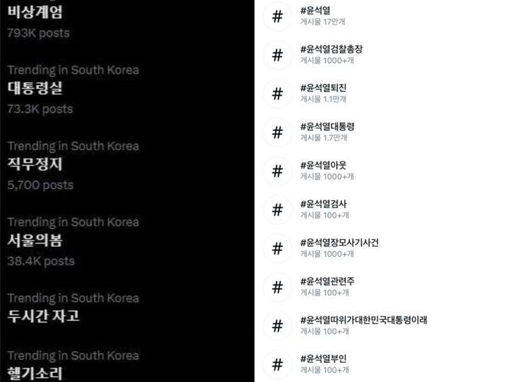 해시태그 내용은 #비상계엄 #대통령실 #직무정지 #서울의봄 뿐만 아니라 #두시간 자고 #헬기소리 등 내용이 공유됐다.