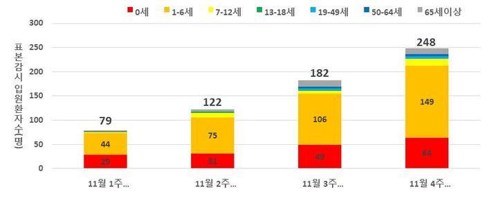 질병청에 따르면 11월1~4째주 호흡기세포융합바이러스 감염증 입원환자 연령은 1~6세 374명(59.3%), 0세 173명(27.4%)으로 0~6세가 86.7%를 차지했다. 7~12세 31명(4.9%), 65세 이상 30명(4.8%) 등이다.