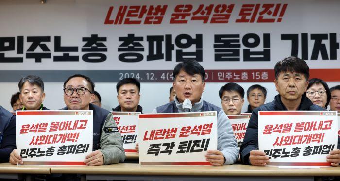 민주노총 중앙집행위원회는 4일 오전 서울 중구 민주노총에서 기자회견을 열고 "윤석열 정권 퇴진 시까지 무기한 총파업에 돌입하기로 했다"고 밝혔다.