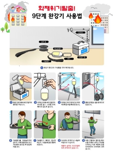 완강기 사용법은 먼저 상자 안의 모든 구성품을 확인하고, 스토퍼와 벨트를 꺼내 사용 준비 상태를 점검하는 것으로 시작된다. 이후 창문 가까이 지지대를 설치하고, 스토퍼를 고정해 떨어지지 않도록 한 뒤, 설치한 스토퍼와 지지대가 안정적으로 고정되어 있는지 다시 확인해야 한다. 다음으로 완강기 벨트를 몸에 착용하며, 벨트는 흘러내리지 않도록 가슴 높이까지 조절해야 한다. 벨트를 착용한 뒤에는 단단히 고정됐는지 재확인하고, 창문을 열어 탈출 방향의 장애물을 제거한다. 탈출 시에는 양손으로 로프를 잡고 천천히 아래로 내려가면서 속도를 조절하고 침착하게 움직이는 것이 중요하다. 마지막으로 지면에 안전하게 도착한 후에는 다른 사람들도 탈출할 수 있도록 도움을 주어야 한다.