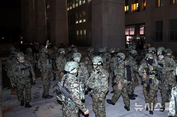 윤 대통령이 전날 밤 10시24분께 비상계엄을 선포한 직후 계엄군은 이날 자정께 국회 본청 진입을 시도했다. 국회 직원과 정당 보좌진이 집기로 출입문을 막는 등 군 진입을 저지하면서 충돌이 일어났다. 계엄군은 새벽 1시 비상계엄 해제 요구 결의안이 국회 본회의에서 가결된 후 철수했다.