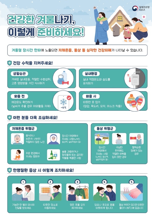 한랭질환 예방수칙으로는 추운 날씨에 야외활동을 자제하고 가벼운 실내 운동 및 적절한 수분섭취가 필요하다.