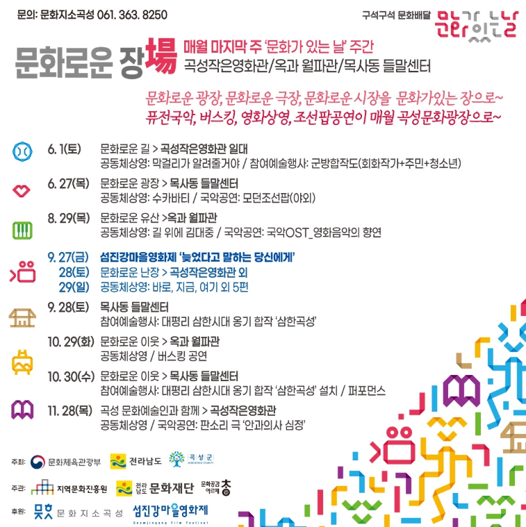 9월에는 문화가 있는 날 주간에 제3회 섬진강마을영화제와 함께하는‘늦었다고 말하는 당신에게’라는 슬로건으로 자연환경의 위기속에 조화로운 마을공동체의 공존을 이야기해보며 문화의제가 일상과 결코 분리되지 않고 우리가 마땅히 누려야 할 생활 속 문화로운 삶에 대한 근원적 물음을 던져보는 시간을 가졌다.