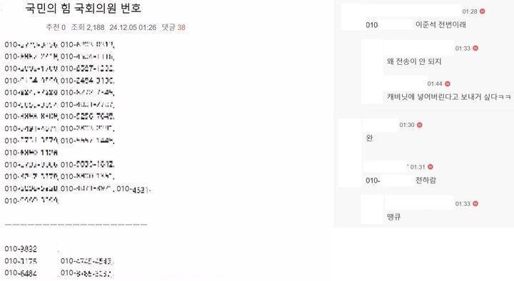 이 글에는 실제 국민의힘 의원들의 것인지 확인할 수 없는 전화번호가 30개가량 적혀있다.
