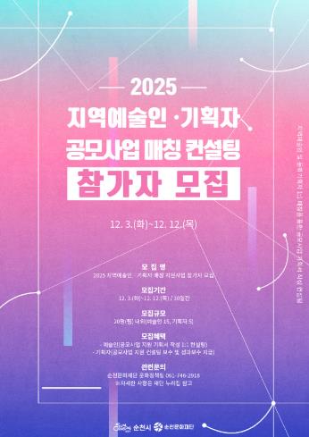 한편, ‘2025 지역예술인·기획자 매칭 지원사업’은 2021년부터 총 133명이 참여했고 공모사업 선정 규모는 총 39건, 54억 9천만원으로 순천 예술인들의 공모사업 접근성을 높이고 자발적으로 활동할 수 있는 기반을 마련하는 데 기여하고 있다.
