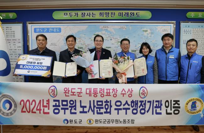 한편 완도군공무원노동조합 김완주 위원장은 건전 노사 관계 구축에 대한 공로를 인정받아 대통령 표창을 받는 영예를 얻었다.